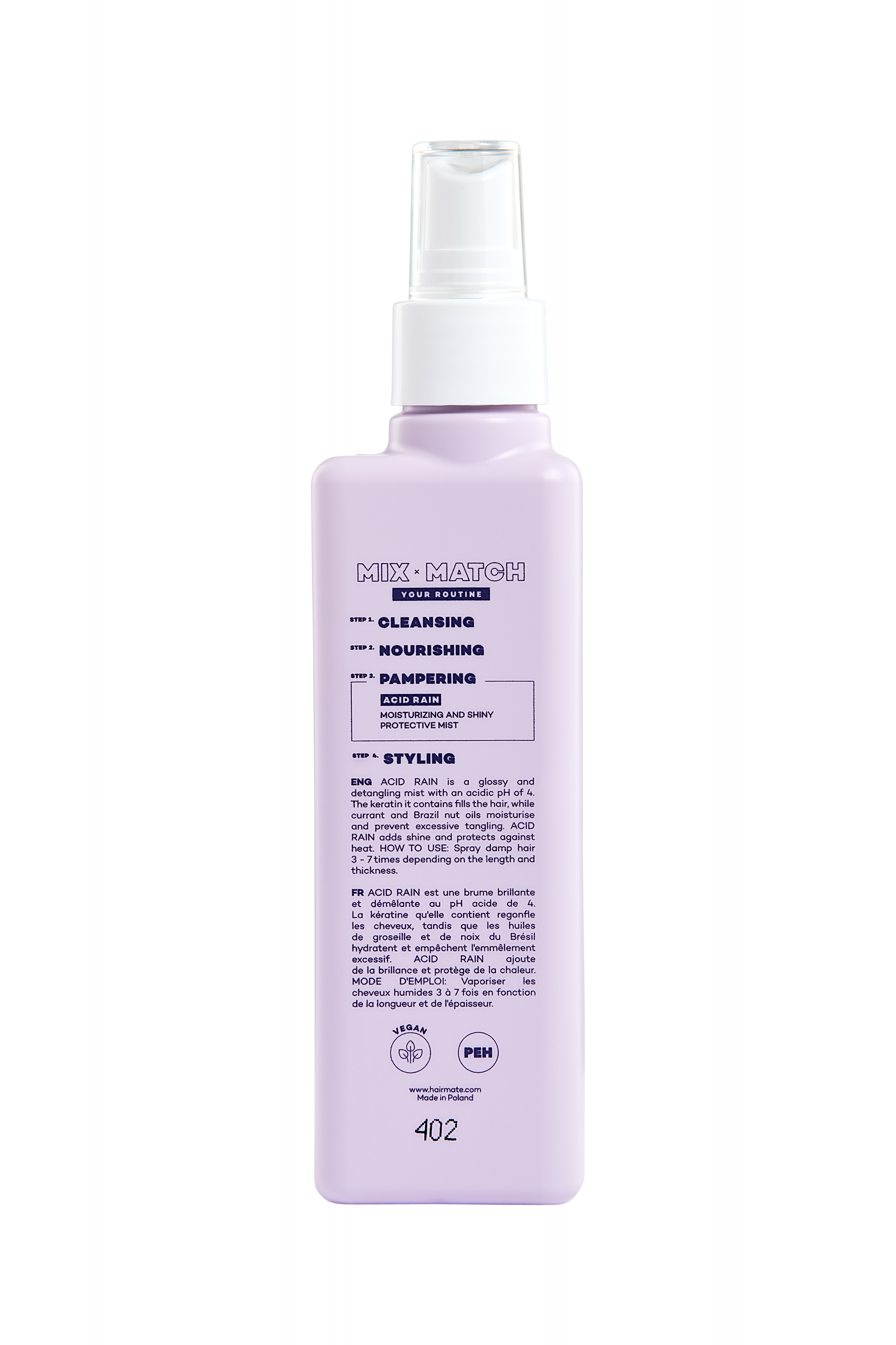 High temperatures don’t have to be a threat to your hair! ACID RAIN is a mist that provides heat protection, detangles every strand, and restores shine. With a pH of 4, keratin, and oils from currants and Brazilian nuts, it protects and strengthens hair, making styling easier while leaving strands soft and glossy. Shine and control in just one spray!