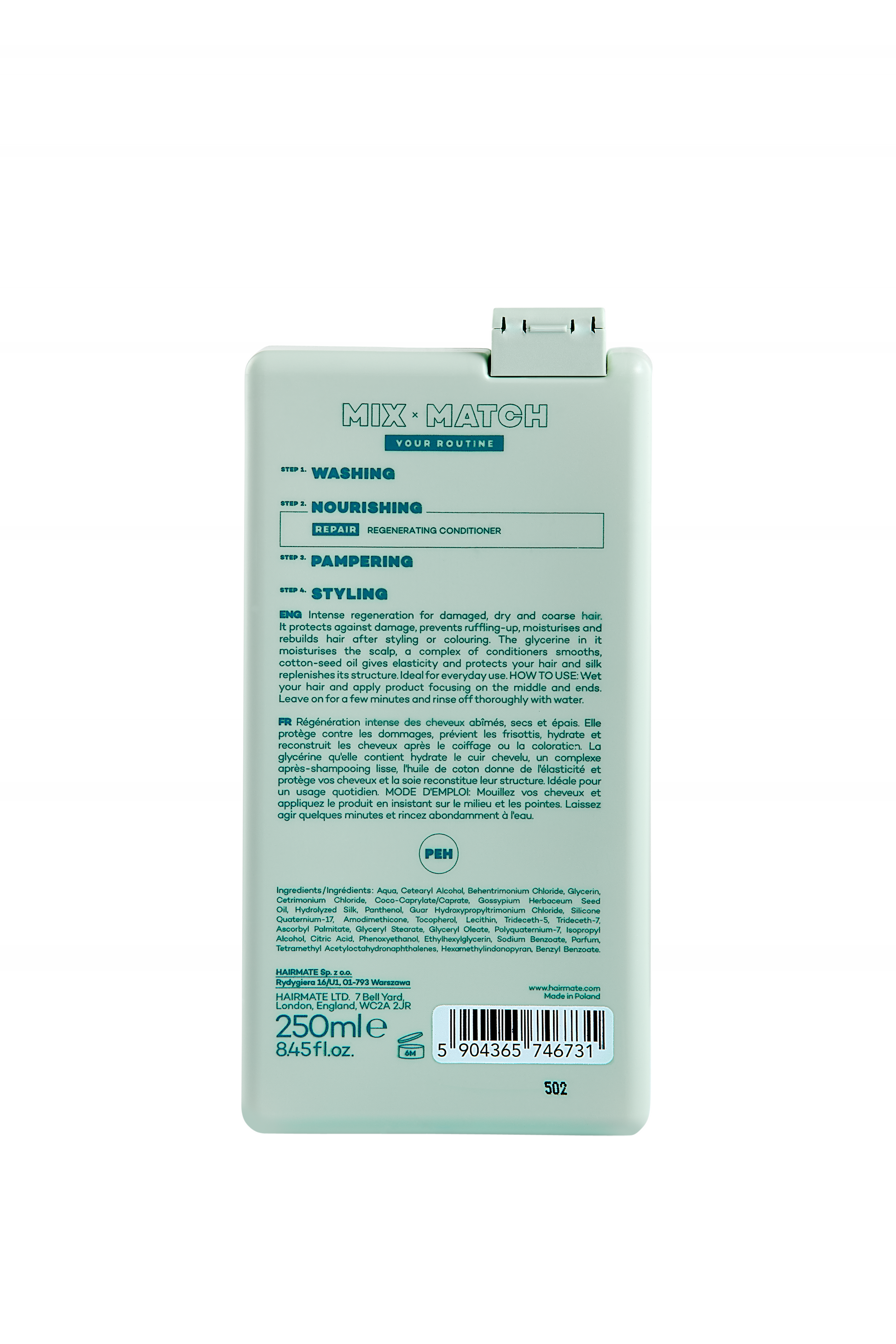 S.O.S for all hair types! REPAIR CONDITIONER regenerates, moisturizes, and protects hair after styling and coloring. Cottonseed oil adds elasticity, silk restores hair structure, and glycerin provides hydration. Every strand feels renewed and ready to shine.